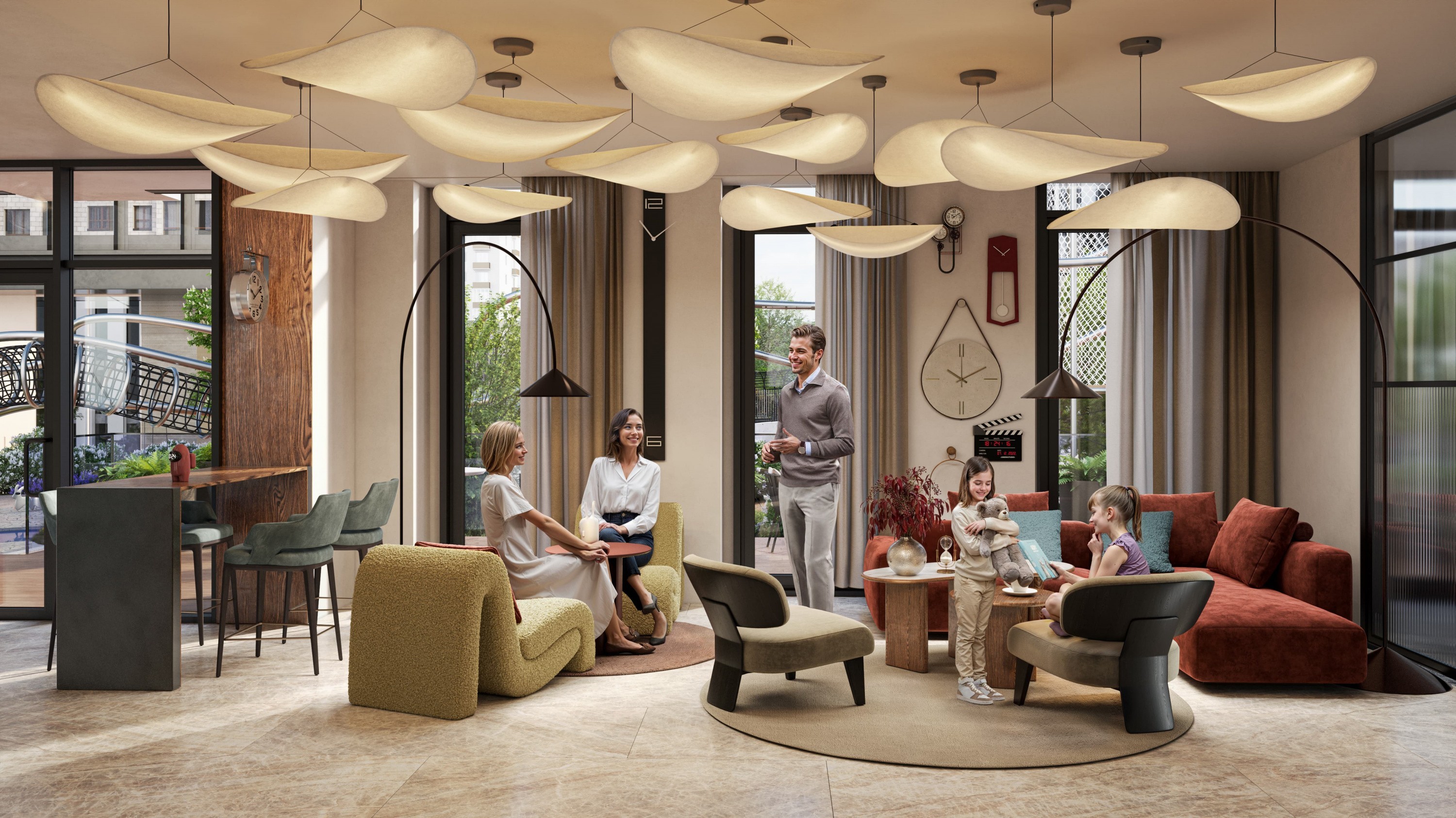 Клубная гостиная с террасой на крыше, где в уютном пространстве можно отдохнуть, поработать, выпить кофе, встретиться и пообщаться с соседями.