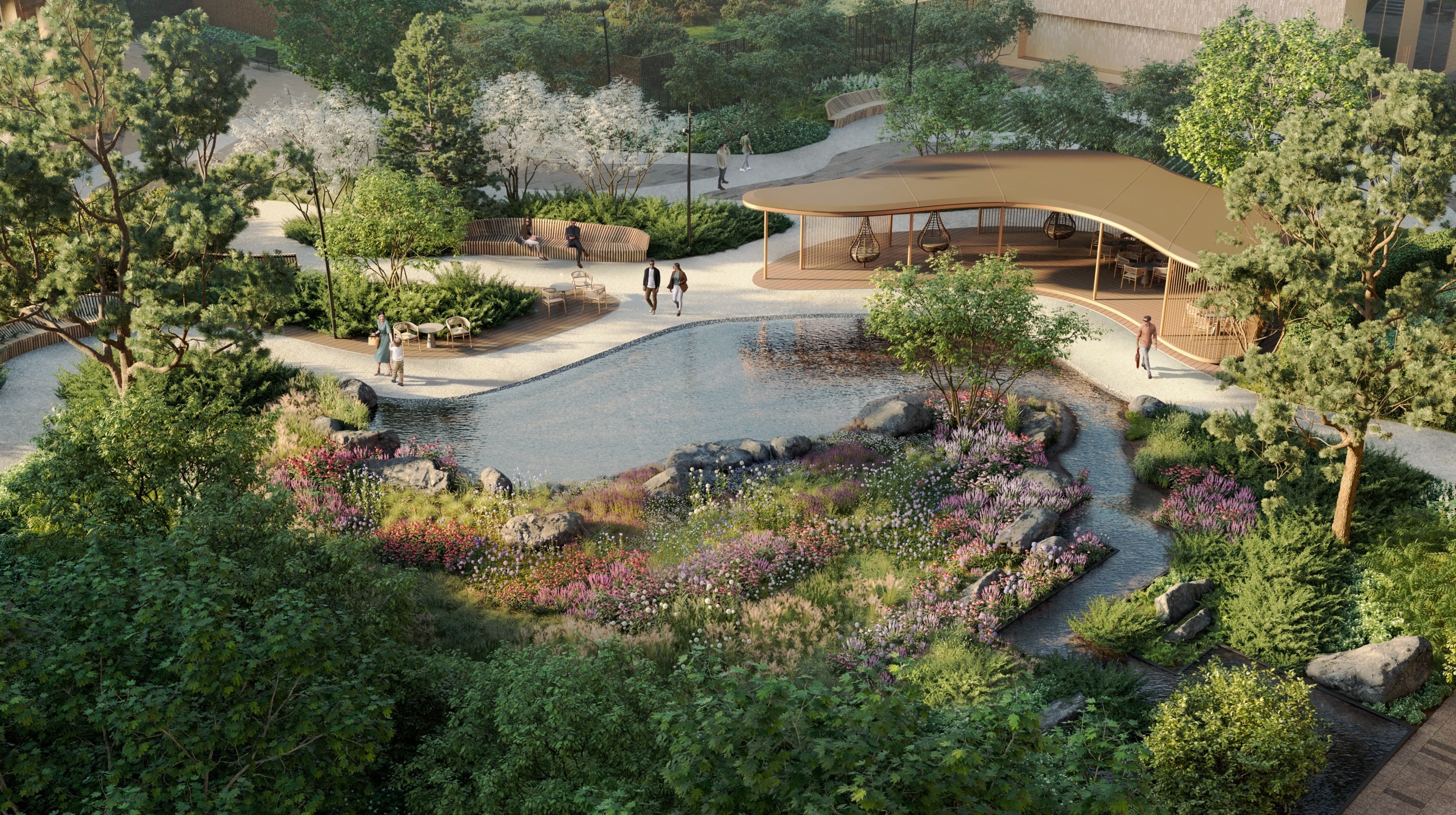 Разноуровневый всесезонный двор-парк с арт-объектами, водоёмами, ручьём, спортивной и детской инфраструктурой.