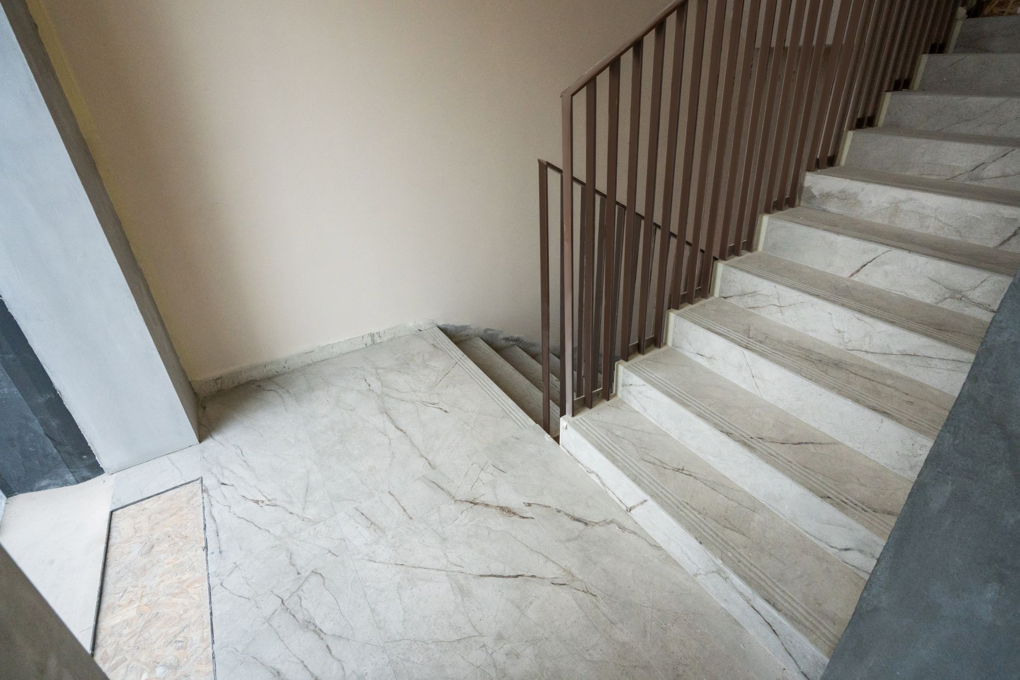 - Приступили к финишной отделке общих зон в корпусе C — укладываем на этажах напольный керамогранит.