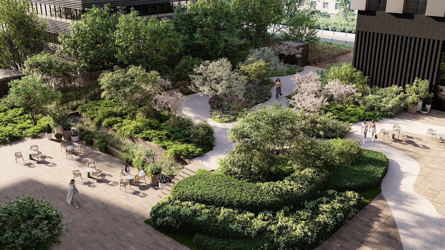 Квартал расположен в собственном огромном дворе-парке площадью 1,8 гектара, закрытом для посторонних. Многоярусное пышное озеленение, цветники и высокие деревья подобраны так, чтобы пространство радовало глаз в любое время года.