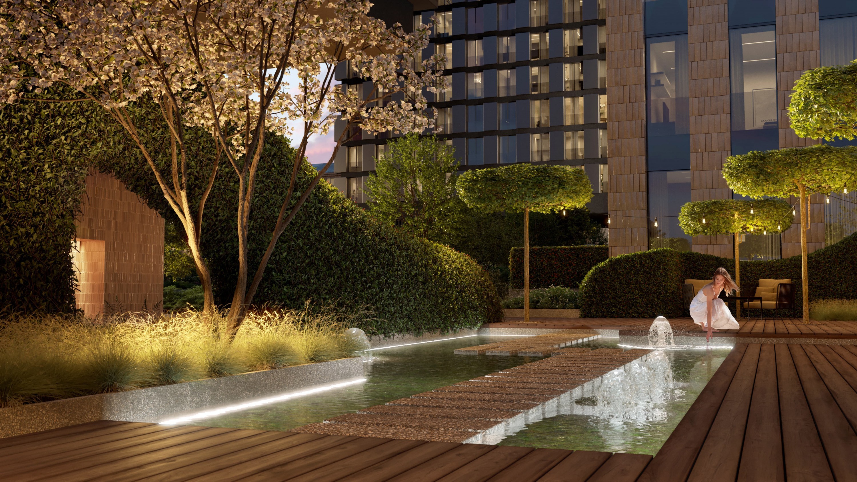 В центре двора-парка расположена просторная зона отдыха с водоёмом, навесом и роскошной пихтой.
