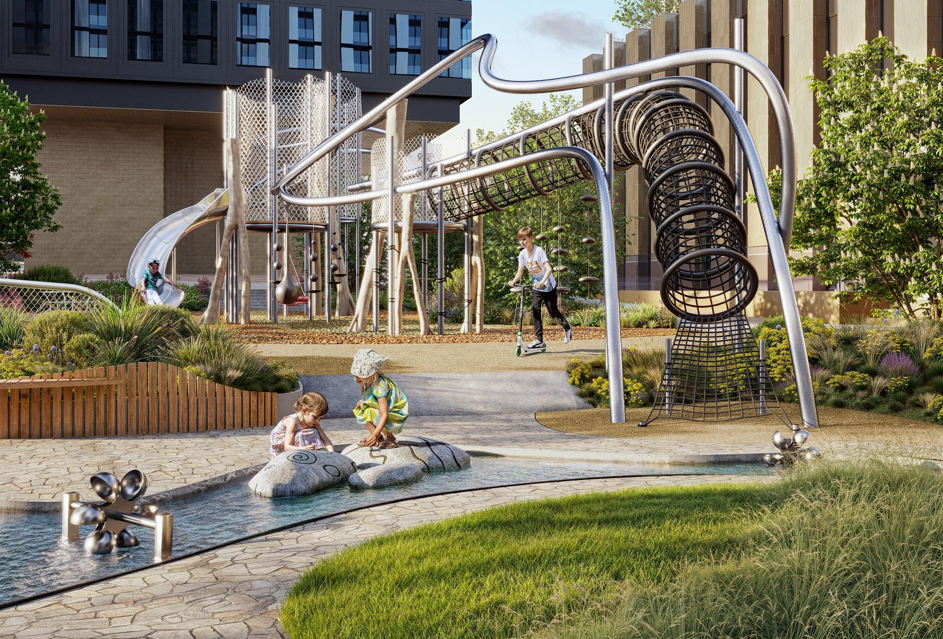 Три игровые площадки рассчитаны на ребят разного возраста, есть встроенная в рельеф необычная горка, водоёмы, сухой фонтан и настоящий ручей для запуска корабликов и игр с водой.
