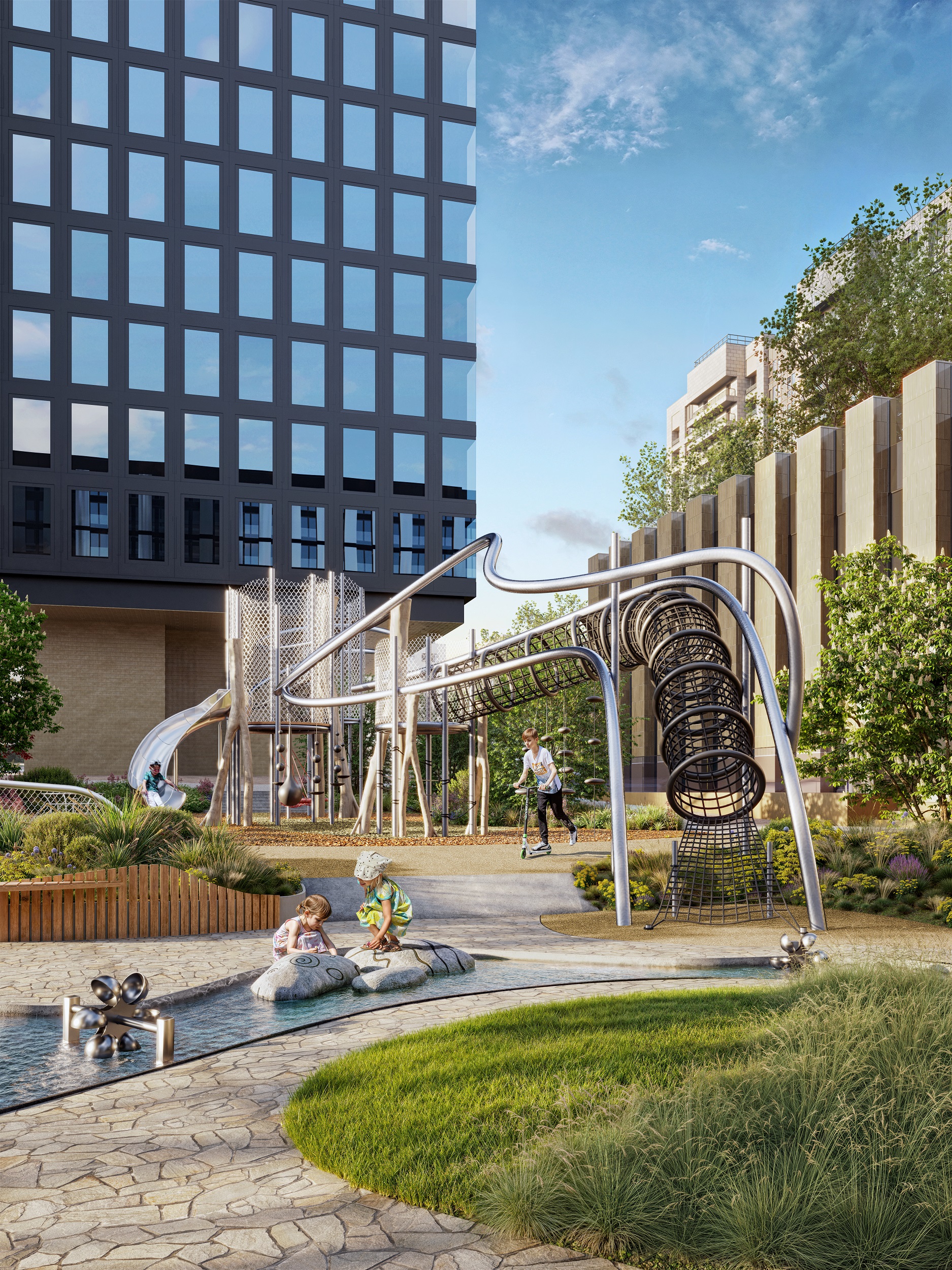 Следуя фирменному подходу к созданию совершенных домов Fine Development, девелопер насытил пространство функционалом для активностей и развития детей разных возрастов и темпераментов. Толщина и тип покрытия площадки меняются в зависимости от вида игровой зоны: от морской гальки до речного песка и резиновой крошки. Чем выше конструкция — тем мягче должно быть возможное падение. Допустимый риск — важнейший компонент игры, который позволяет детям почувствовать дух авантюризма.