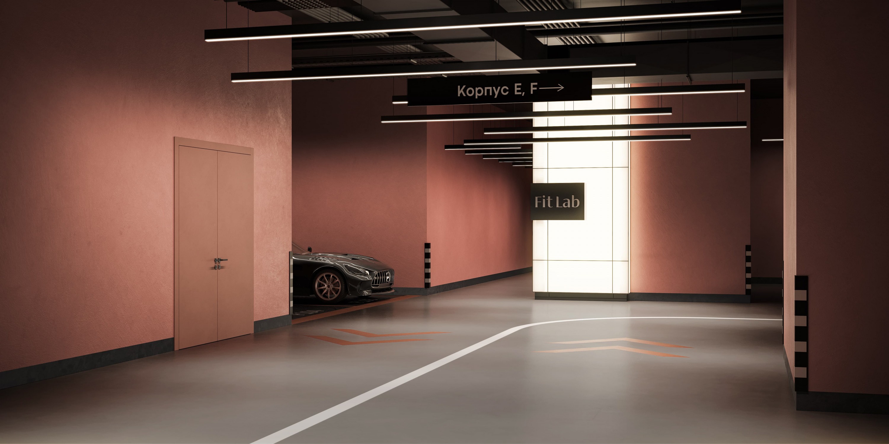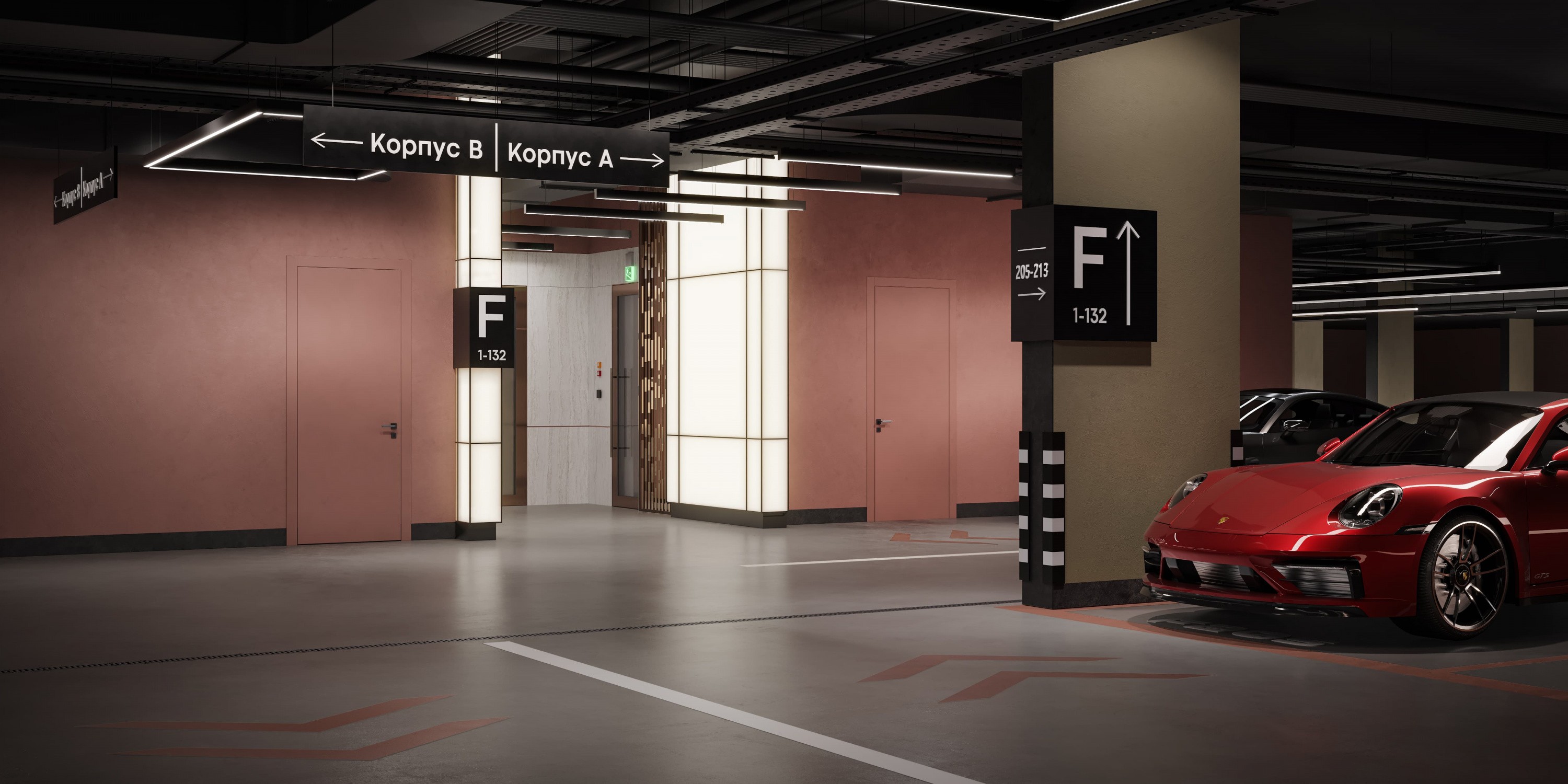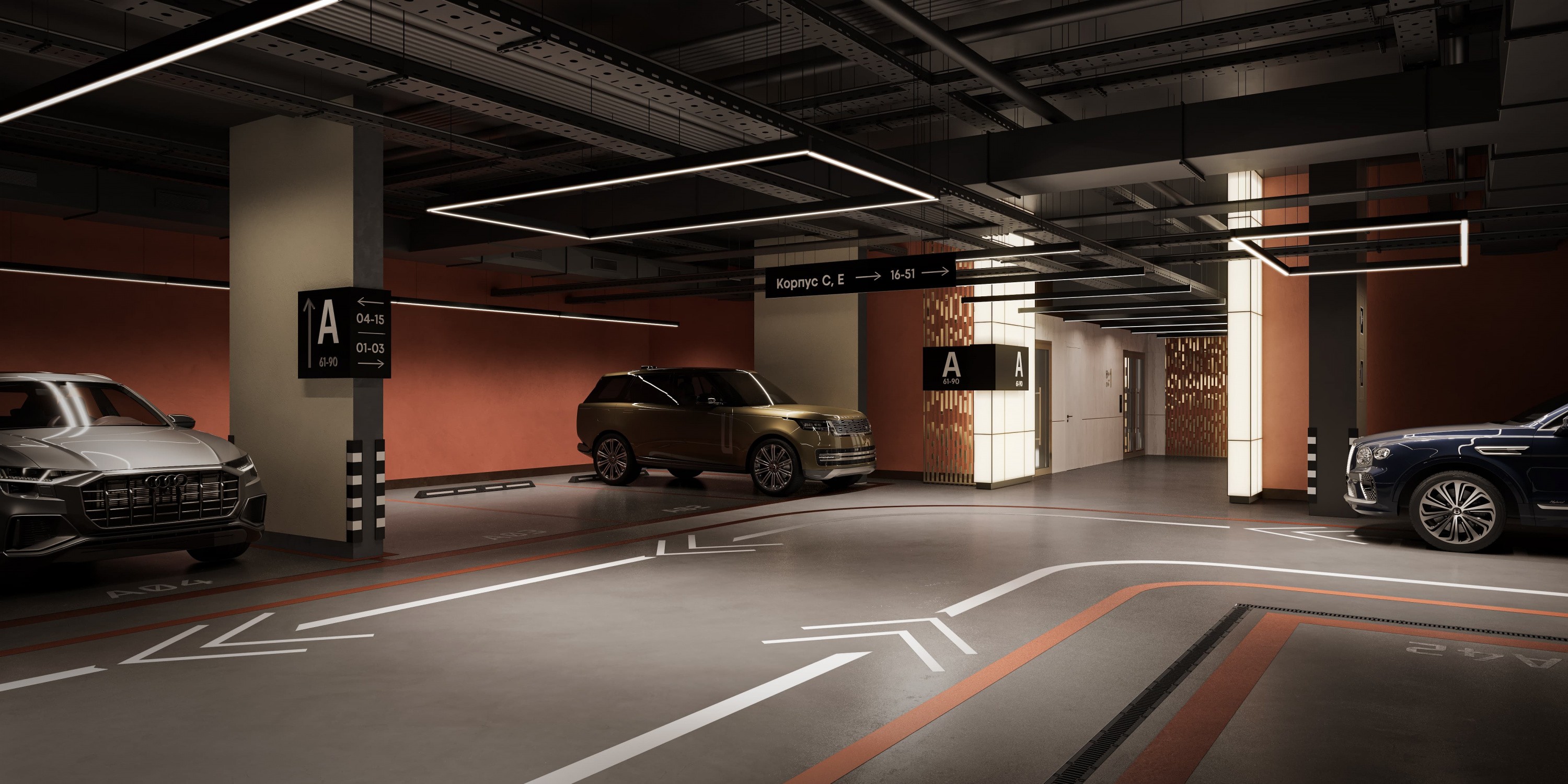 На подземном уровне расположен комфортный охраняемый паркинг, куда спускаются лифты прямо с жилого этажа. Мы сделали это пространство красивым и уютным, чтобы, выйдя из автомобиля, вы сразу чувствовали себя как дома.